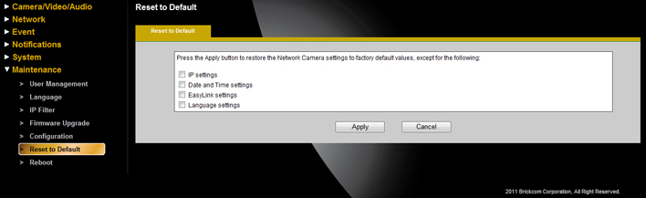 1、通过GUI重置摄像机:请前往设置页面,在维护选项下可找到重置默认设置
