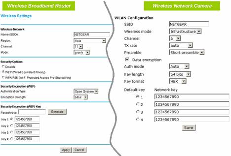 ⑶请检查摄像机和无线AP的设置是否一致。请参照图检查摄像机和无线AP的SSID / Preamble / Security Options / Data Encryption / Key length / Key format / Network key是否一致。