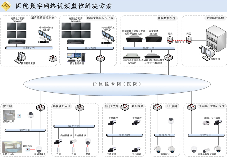 金砖通讯(Brickcom)医院数字网络视频解决方案,专为医院建设“多媒体、网络化、数字化、智能化、全方位”视频综合指挥系统,为解决医院安防、医患矛盾、高危病房、隔离病房、远程会诊等业务需求奠定基石,医院的实时高清无缝覆盖监视、图像存储、历史录像查询、云台操作控制、智能报警、监听、入侵检测和指挥为突发事件响应赢得了宝贵的时间和依据,具体内容包括:护士站、药房、ICU病房等重要区域的报警探测器联动视频画面弹出、报警声音、邮件发送等事件,挂号收费工位监控防止违规操作,划价收费系统通过用户权限分配或网络划分与院区安保系统实现安全隔离,后端系统由CMS门户管理平台、电信级综合管理平台、海量存储、高清数字矩阵、中央控制单元、分控单元等组成,具体实现有上海皮肤病医院、杭州精神病医院、吉林省人民医院等应用