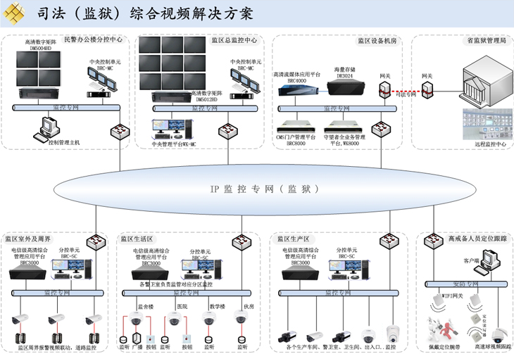 金砖通讯(Brickcom)监狱综合视频解决方案主要为监狱生产区、生活区、高戒备区、监区室外及周界建设高清数字全覆盖,各区域单独设有监视分控中心,实现存储及转发媒体流,监区设有安防总监控中心管理监视整个监区道路、出入口、周界、公共场所主要活动区域,民警分控中心主要实时监视在押囚犯的日常活动及处理事件录像查询,包括生活区需要实现监听、对讲、报警等一体化功能,生产区需要监视人员设备作业状况,高戒备区的人员定位联动视频跟踪,如:在规定区域内,高戒备区囚犯一旦越过该区域,相关摄像机即刻跟踪及视频画面弹出,系统组成由CMS门户管理平台、综合管理平台、海量存储、高清数字矩阵、中央控单元等,另综合管理平台支持第三方音视频标准,通过司法专网实现与上级管理监控中心的系统视频整合,解决方案成功应用于浙江省第二监狱、第六监狱、乔司监狱等…