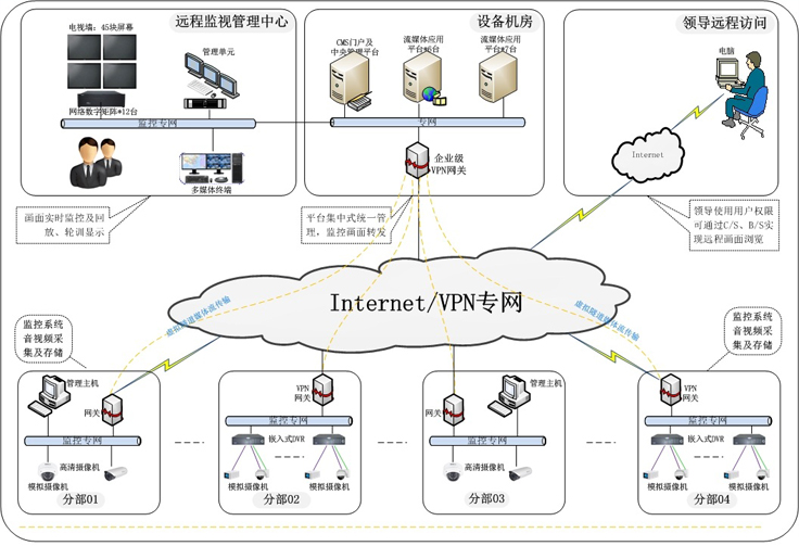 金砖通讯网络视频大联网解决方案主要应用于连锁商超、总部分部等企业环境实现音视频统一整合,各商城、超市、分支机构等区域,利用Internet(VPN)或内部专网实现与总部的实时流通讯,通过总部部署综合视频管理系统,采用先进的视音频编码技术、流媒体技术、智能分析技术、信息安全技术、集群管理等关键技术,实现对全国各地分支机构等子系统音视频预览、回放、事件联动等各种功能整合,不仅是原有模拟监控系统(DVR+模拟摄像机)、或是新建高清网络数字监控系统(IPC+NVR)等都能实现无缝接入,Brickcom通过实践应用中获悉,视频监控联网因涉及区域较广、通道数量较多、带宽资源、网络传输安全等因素,不能理解为单纯的音视频监控,其网络的安全互联、音视频的有效畅通更应关注,也因此Brickcom凭借二十多年的网络通信经验加专业的音视频技术,结合网络环境(网络类型、网络带宽)与实际使用需求(通道带宽、通道数量)等条件,设计并成功应用于国内知名物流企业全国7000多路音视频整合。